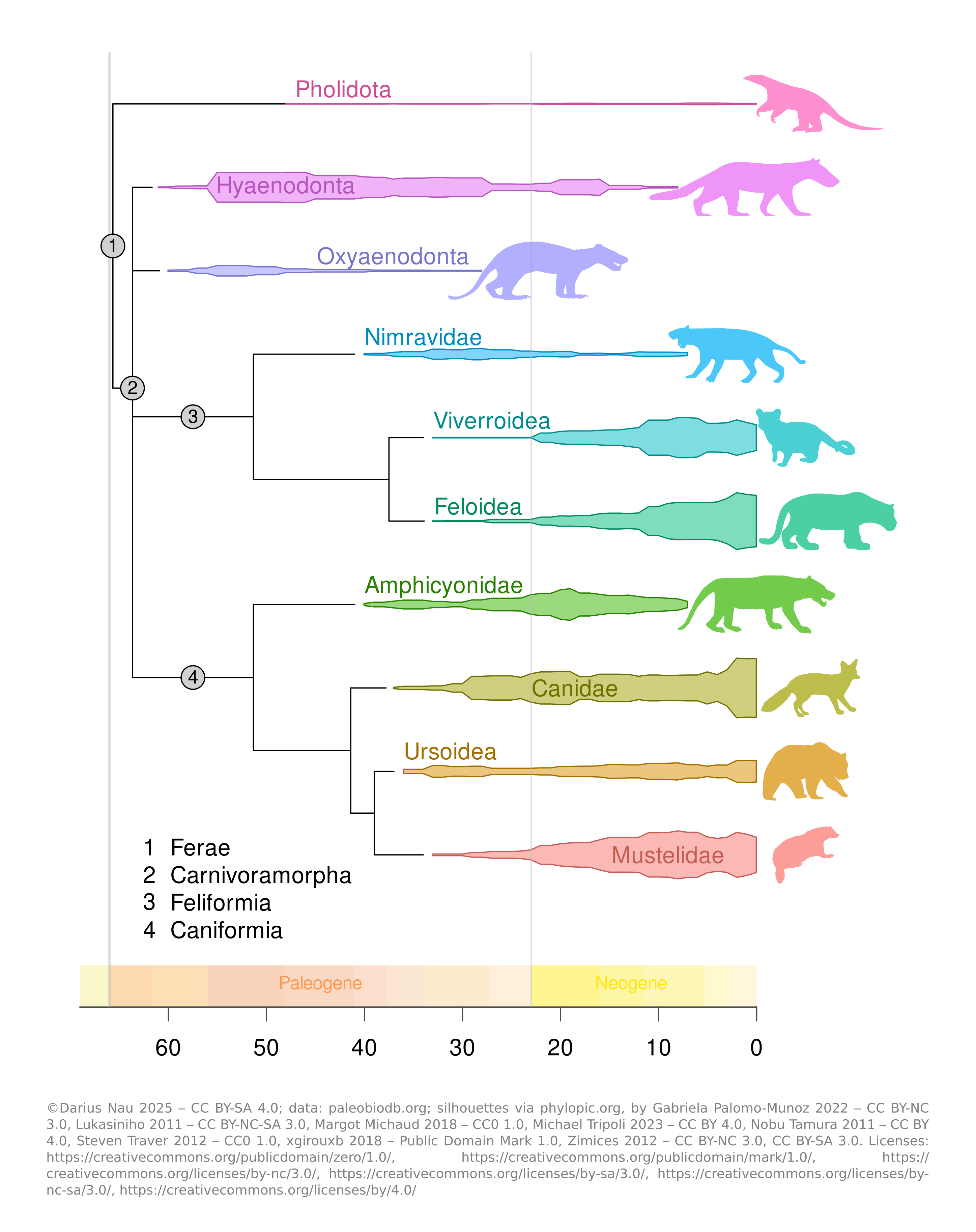 Diversity and phylogeny of Ferae: carnivorans and allies, including the extinct order of "creodonts". Also available as a printable version (PDF, A4 page width).
